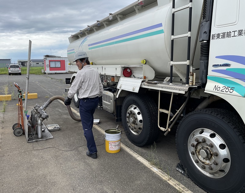東港営業所構内において、指導社員のもと模擬荷卸設備を使用して、作業の流れ、客先での接遇、バルブ及び荷卸しパイプの取り回し方や指差確認要領について、何度も反復練習を実施して荷卸作業でのトラブル”ゼロ“を目指しています。